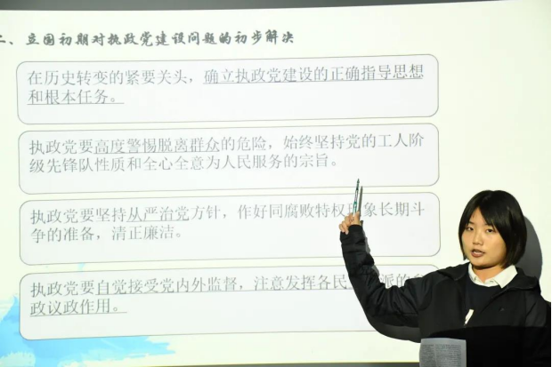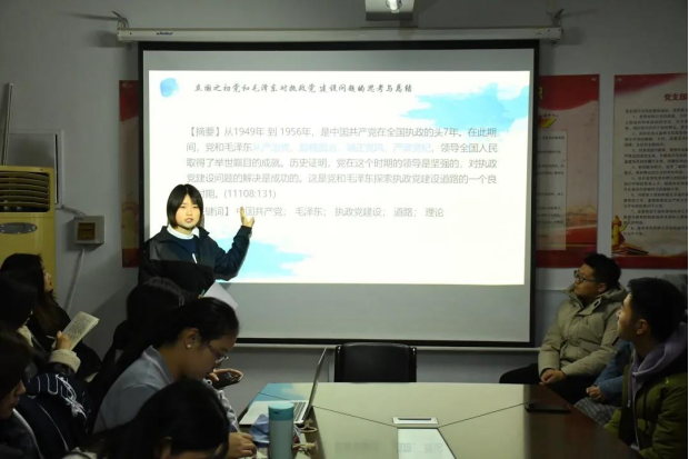 本次学术讲座由2020级党的建设专业翟玉同学主讲,翟玉同学主要从“中国共产党面临的执政新考验”、“立国初期对执政党建设问题的初步解决”、“八大执政党建设经验的总结”三个方面进行了讲解。首先,翟玉同学讲述了建国初期,中国共产党面临着政治、经济、军事、外交等一系列严峻的考验。其次,她详细介绍了毛泽东与党中央基于这些考验,对症下药,提出端正党风、从严治党、严肃党纪等具体方案。最后,翟玉同学指出总结党在历史工作中的经验教训具有重要意义。她认为,中国社会主义建设过程中少犯错或不犯错的关键就在于我党不断总结工作中出现的经验教训。