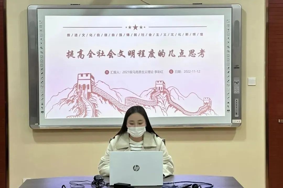 11月12日晚,公司研究生会“悦读二十大,奋进新征程”学习贯彻二十大精神系列活动第二期在二办203举行。系列活动第二期以“推进文化自信自强,铸就社会主义文化新辉煌”为主题,共有四位主讲人参与主讲,第二讲主讲人为2021级马克思主义理论专业研究生李彩红。本次活动采用线上线下相结合的方式,全院90余研究生参加了此次活动。