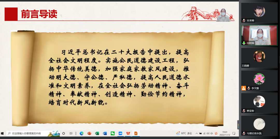 李彩红同学主讲的题目为《提高全社会文明程度的几点思考》。她从二十大报告中关于提高全社会文明程度的原文引入,分三个部分进行了主讲。第一部分讲解了在推进新时代公民道德建设时要如何处理好“知”与“行”的关系,以及推进新时代公民道德建设的四种方式,即推进马克思主义理论研究和建设工程、大力开展道德模范和先进典型评选推荐活动、强化理想信念教育、加强公民道德建设宣传等;第二部分介绍了加强家庭家教家风建设的相关政策和活动,并具体介绍了加强家庭家教家风建设的三种方式,包括完善保证制度、加强家庭伦理教育、开展文化实践活动等;第三部分提出了推进城乡文明建设融合发展的三条措施,即要面向城乡基层扎实推进文明实践、以科学化制度化巩固拓展文明创建工程、不断丰富和改善人民群众精神文化生活。
