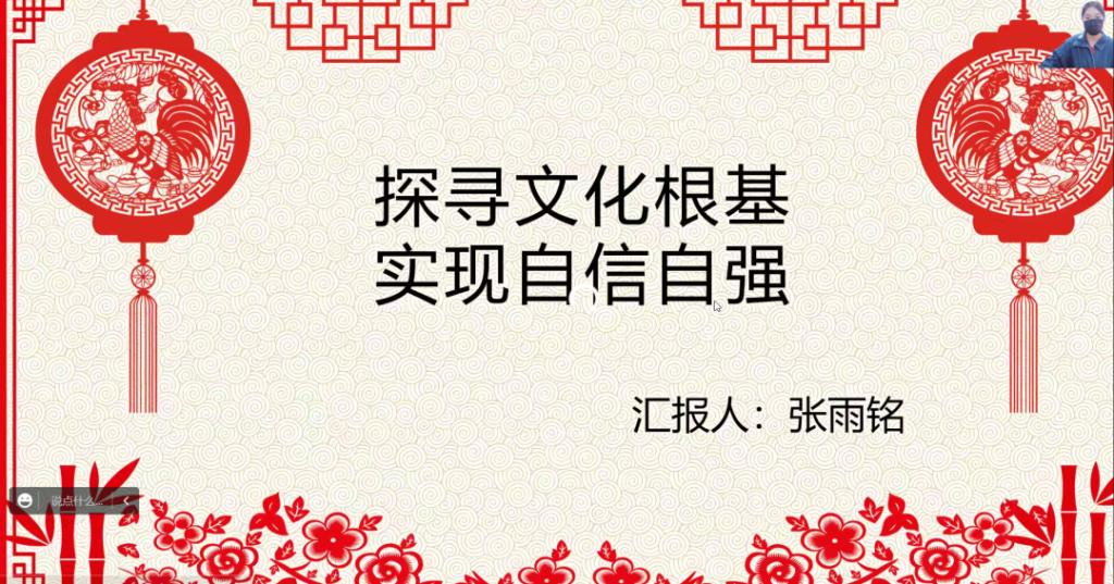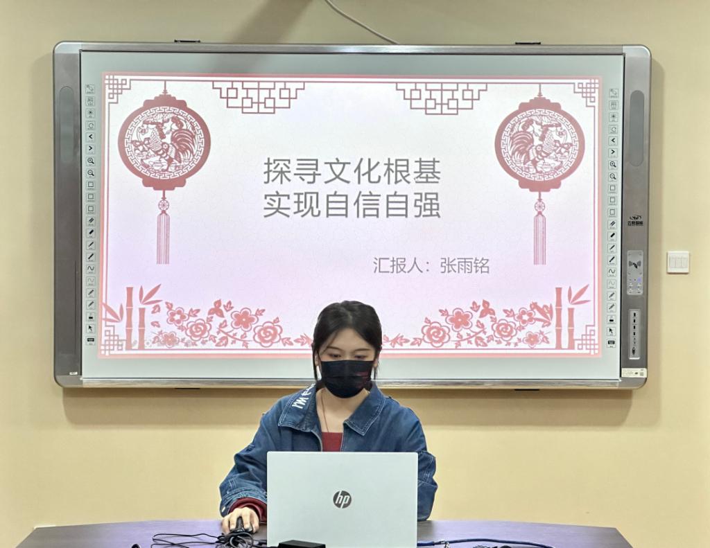 张雨铭同学主讲的题目为“探寻文化根基,实现自信自强”。她首先解释了文化自信的概念,并从国家和个人两个角度说明了我们为什么要坚定文化自信以及文化自信对于祖国和个人的意义。其次,张雨铭同学从优秀传统文化是文化自信的支撑,以及文化自信能够促进中华优秀传统文化的传承和发展两个方面揭示了优秀传统文化和文化自信的关系。然后,通过列举舞蹈“只此青绿”和冬奥会吉祥物“冰墩墩”两个宣扬传统文化成功的案例来说明增强文化自信的方法。最后,张雨铭同学阐述了我们对待中华文化和外来文化时分别应该采取的态度。