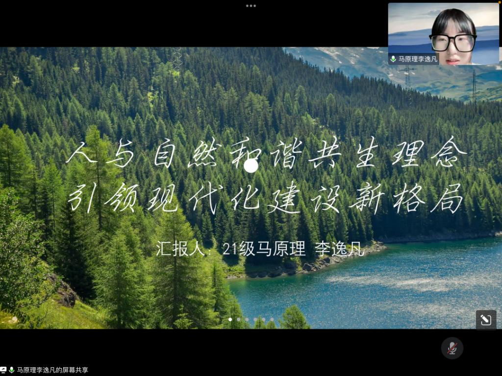 李逸凡同学主讲的题目为《人与自然和谐共生理念引领现代化建设新格局》,具体内容由人与自然理念溯源、人与自然和谐共生理念的内涵、人与自然和谐共生理念的实践路径三部分构成。第一部分中她讲到人与自然的理念先后经历了远古时期的神话自然观、整体自然观、中世纪宗教神学自然观、“天人对立”自然观和马克思自然观几个阶段。第二部分中她指出人与自然和谐共生理念不仅指明了人与自然的辩证统一关系,而且展现了以人民为中心的发展理念和打造人类命运共同体的大国风范。第三部分中她重点谈到了推动人与自然和谐共生要坚持正确生态观,加强生态法治建设,构建绿色发展新格局。