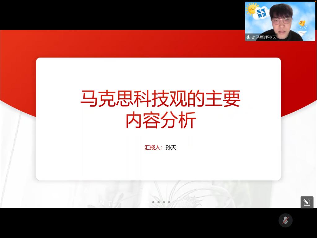 孙天同学主讲的题目为《马克思科技观的主要内容分析》,具体内容由科学技术动力论、科学技术社会论、科学技术异化论三部分构成。第一部分中他指出了科技不仅能够提升劳动者素质,而且能够推动生产工具变革和劳动对象的开发。第二部分中他探讨了科技会扩大生产的范围与内容、改变人们的价值观念、促进资本主义世界市场的形成,从而推动生产关系的变革和世界历史的发展。第三部分中他重点谈到了科技对人的异化和对自然的异化,其中科技对人的异化体现在科技会给工人带来物质生存方面的异化、造成人性的异化,科技对自然的异化表现为资本家滥用科学技术导致生态危机和环境污染等问题。