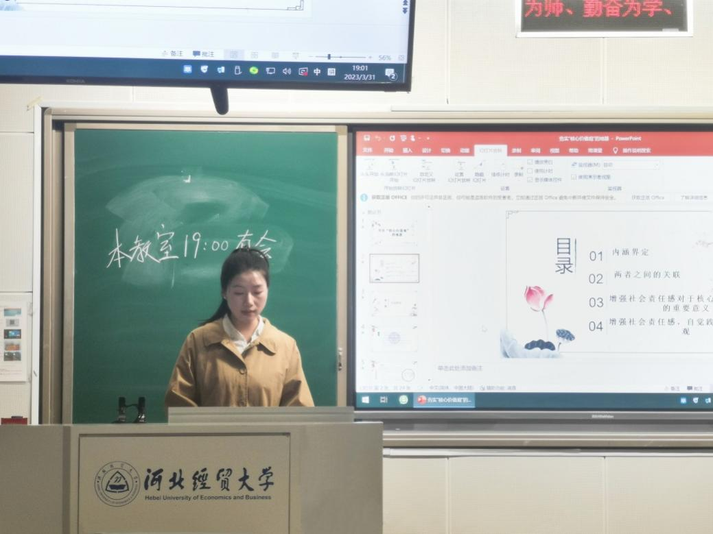 3月31日晚,公司“践行二十大,学‘习’讲故事”学习贯彻二十大精神系列活动第三期在北三教A104举行。系列活动第三期以“社会责任感”为主题,共有四位主讲人参与主讲,第一讲主讲人为2022级马克思主义理论专业研究生崔梦莹,主讲题目为《社会责任感与社会主义核心价值观的践行》。全院59名研究生参加了此次活动。