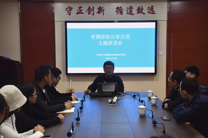 为积极响应“就业创业服务月”活动,激发公司研究生考博热情,鼓励同学们继续深造,公司于11月16日在二办203会议室举办了考博经验分享交流会。此次座谈会由研究生正科级辅导员周献术老师主持,公司党委副书记刘志峰、辅导员老师黄少雄博士、蒋志远博士、路艳丽博士和在读研究生代表参加。