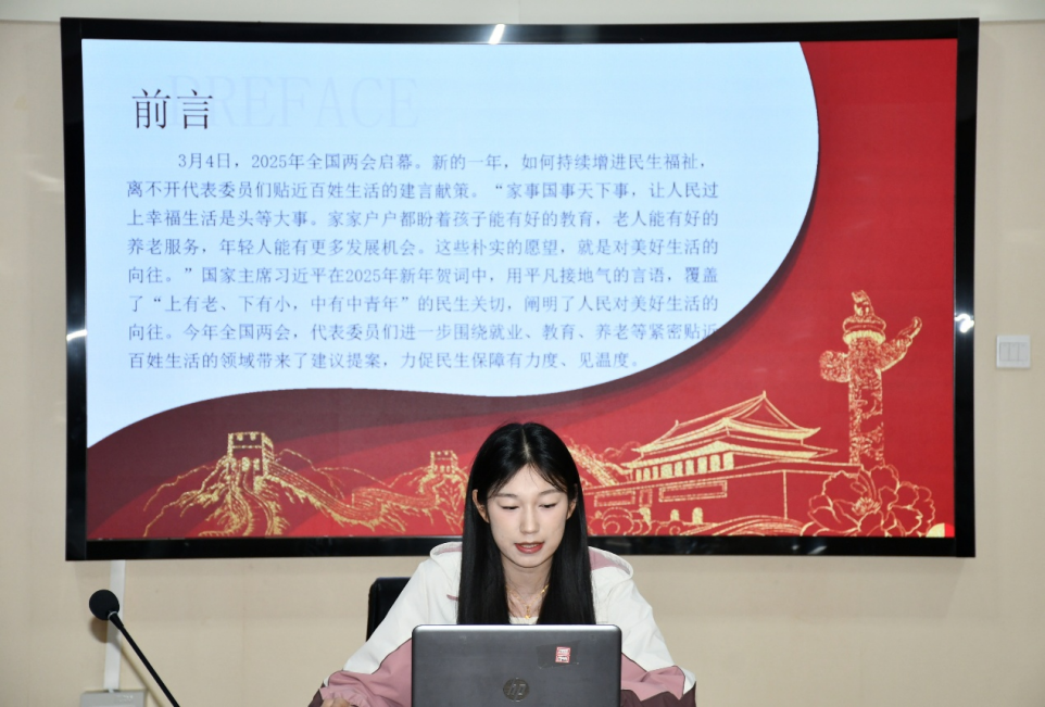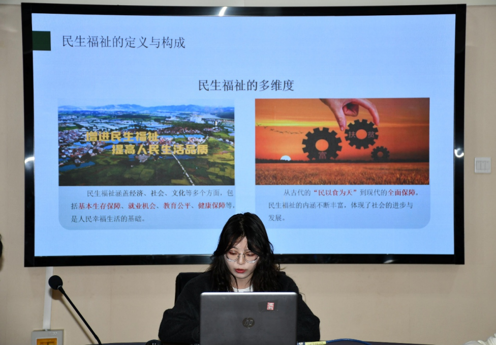 孙玉娇同学主要介绍了中国式现代化进程中推进民生建设的基本遵循、实践进路、现实成就及发展目标;齐赏同学围绕民生福祉的基本内涵进行解读,阐述了优化社会保障结构与增进民生福祉之间的内在联系;李宗琦同学聚焦民生品质提升,阐述了助力民生福祉增量提质的实践路径;韩梦林同学分享了民生工程的重要意义、发展现状及未来展望,强调新形势下要凝聚发展合力,厚植民生福祉。