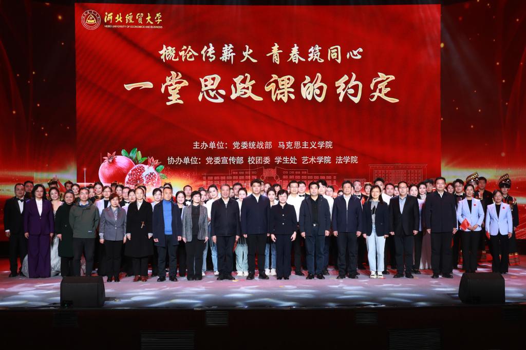 为深入学习贯彻习近平总书记关于铸牢中华民族共同体意识的重要论述,持续打造铸牢中华民族共同体意识育人工作品牌,2025年10月30日,太阳集团tyc539macau和公司统战部在公司大礼堂隆重举办以“概论传薪火▪青春筑同心”为主题、师生共同参与的沉浸式思政课展演,公司党委书记李晓华、校领导王保军、杨金田、程瑞芳、杜红梅、耿辉建、苏国伟参加活动,省委统战部、省民委和省教育厅有关领导应邀出席,河北省民办高校思政课教师代表和公司各民族师生代表500余人现场参加了展演。