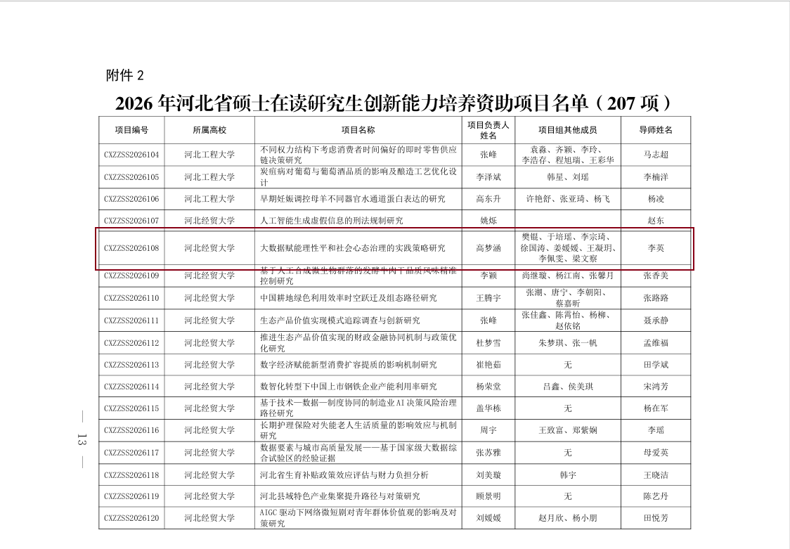 2024级马克思主义理论专业研究生高梦涵同学(导师:李英)主持申报的《大数据赋能理性平和社会心态治理的实践策略研究》获批2026年河北省在读研究生创新能力培养资助项目立项。2024级研究生王一茗(导师:郭建)、王苏畅(导师:刘志峰)、韩梦林(导师:赵立永)、李宇佳(导师:周娜)分别申报的课题,成功获批2026年校级研究生创新能力培养资助项目立项。