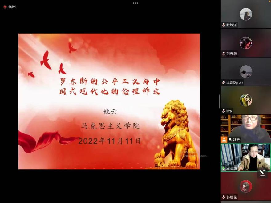 为深入学习贯彻党的二十大精神,系统掌握习近平新时代中国特色社会主义思想。11月11日晚,公司开展了以“罗尔斯的公平正义与中国式现代化的伦理诉求”为主题的宣讲活动。此次宣讲采用线上模式,原理教研室党员、研究生支部党员、积极分子等100余人参加了此次会议。