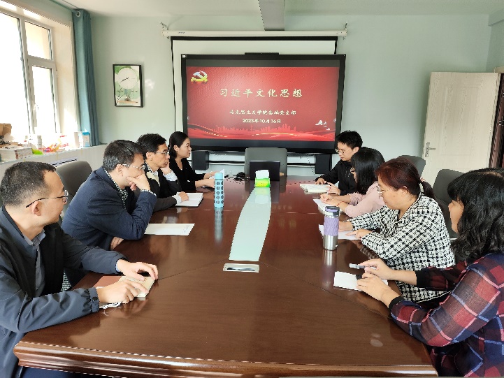 为深入学习贯彻习近平文化思想,增强自身本领,切实做好思政育人工作,基础教研室党支部于10月16日下午在二办202开展习近平文化思想集中学习活动。