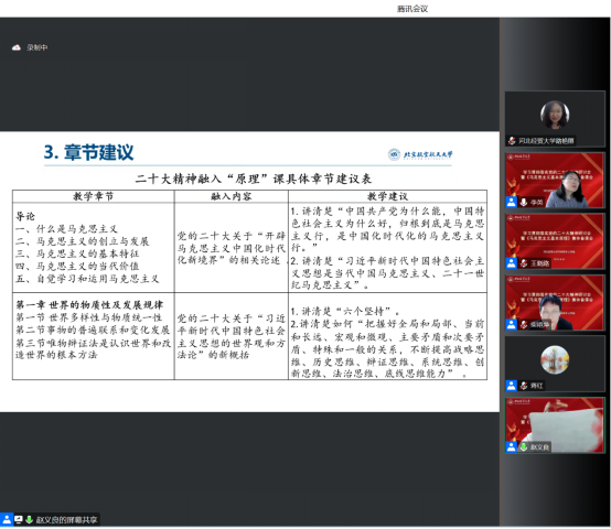 备课会阶段,专家围绕如何讲好《马克思主义基本原理》课程做了生动形象的发言。中国人民大学刘建军教授在报告中就习近平新时代中国特色社会主义思想的世界观和方法论,以及如何融入《原理》课提出了建议。中国人民大学郝立新教授从《原理》课教学如何贯彻落实二十大精神做了分析,提出要讲好道理,要将“两个行”、“两化”、“两个结合”等方面讲清楚。北京航空航天大学赵义良教授认为当前融入尚存在一些问题,并就党的二十大精神融入《原理》课的章节给出了具体建议。北京师范大学熊晓琳教授认为讲好《原理》课,要“把握标准,突出要求”、“全情投入,精心设计”、“学深悟透,有机融合”,使《原理》具有政治高度、学理深度和教育温度。太阳集团tyc539macau王晓路副教授谈了新教材学习心得和教学建议,认为要实现马克思主义基本原理守正创新,需要处理好结论的“叙述”方式和“论证”方式的关系,实现《原理》课程三大部分的有机融合与重构。