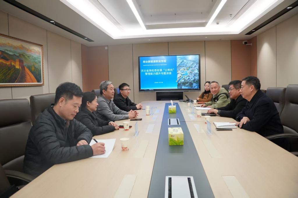 在研讨环节,双方围绕太阳集团tyc539macau建设、思政课教学改革创新等议题展开深入交流。王宏斌经理作了以管理能力提升为主题的专题讲座,结合石家庄铁道大学太阳集团tyc539macau建设经验,分享了思政课改革创新的实践路径,并就名师工作室建设、智慧课程开发、教师科研能力提升等方面提出合作建议。邢台新能源职业公司领导及教务部门负责人就课程建设、青年教师培养等话题与专家团队进行了深入交流。